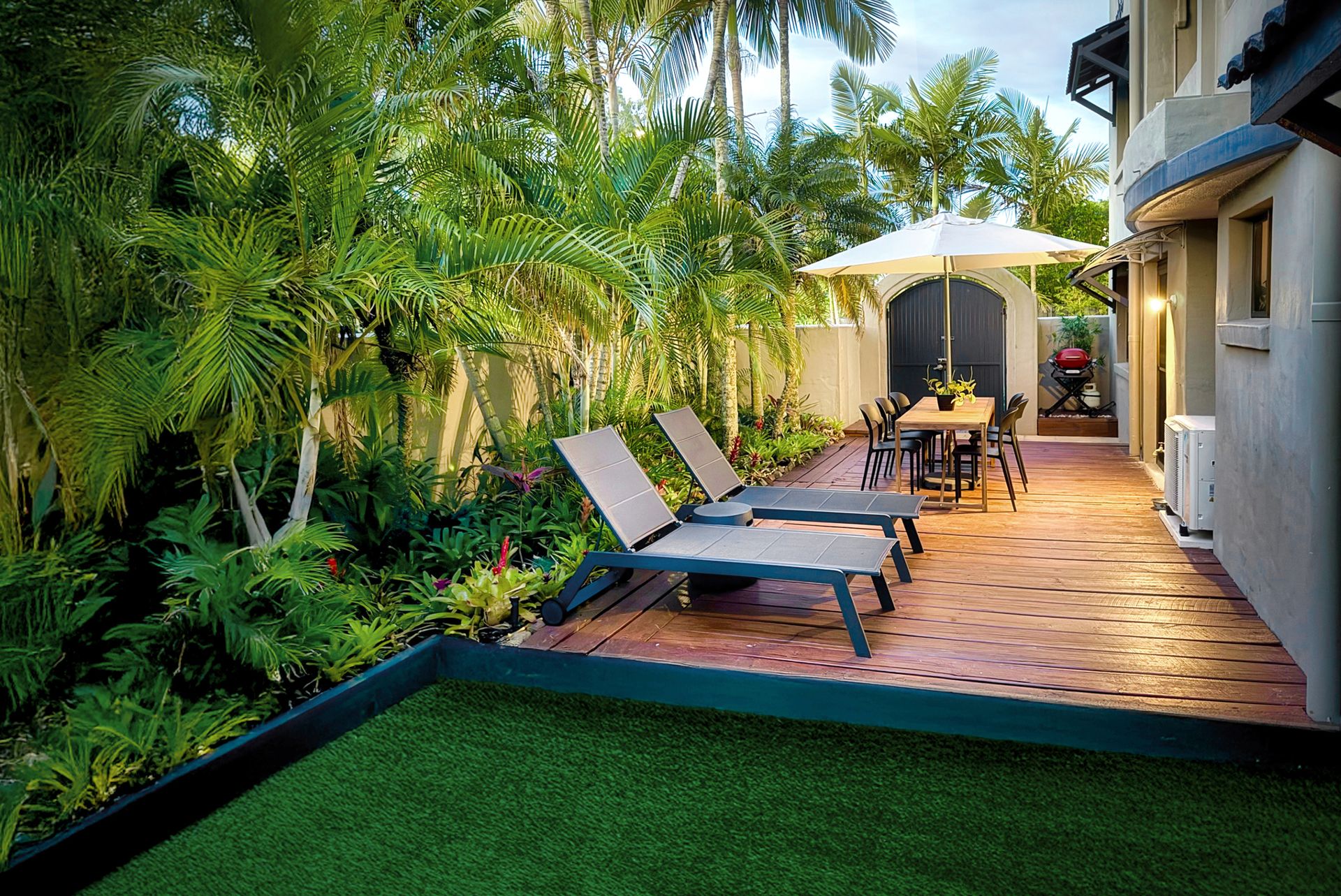 1 Belmondos is a ground-floor apartment with a generous private courtyard and lawn.