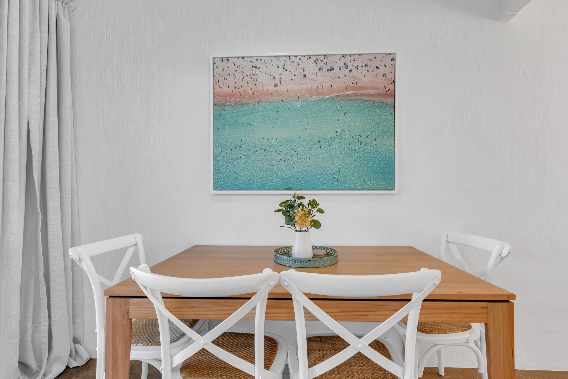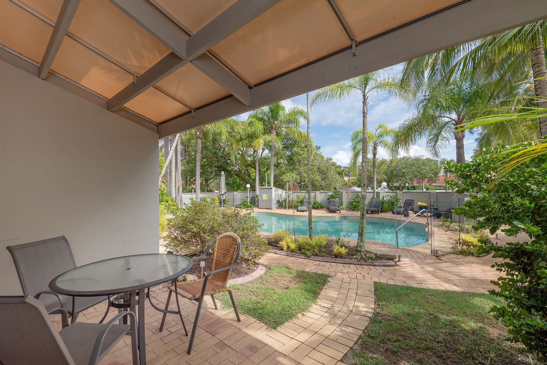 Set over two levels, you have a bright open plan living area downstairs, with a private patio with outdoor setting overlooking the pool and a modern kitchen and dining area.