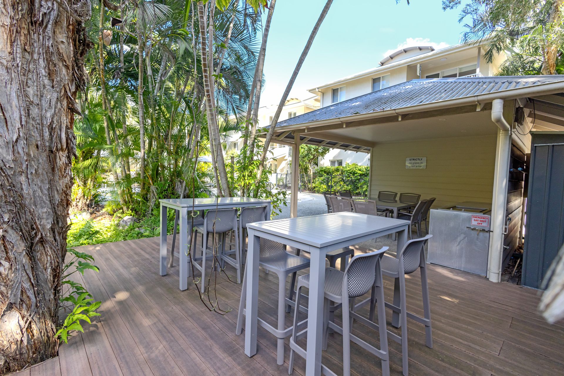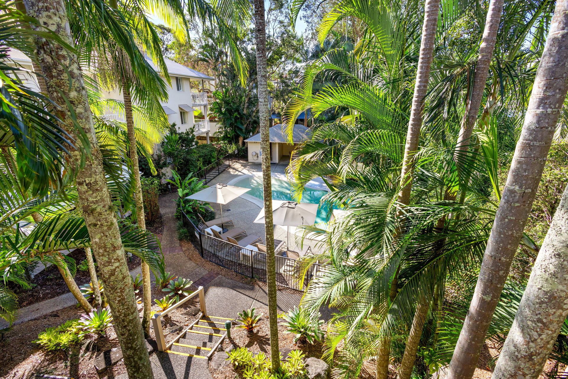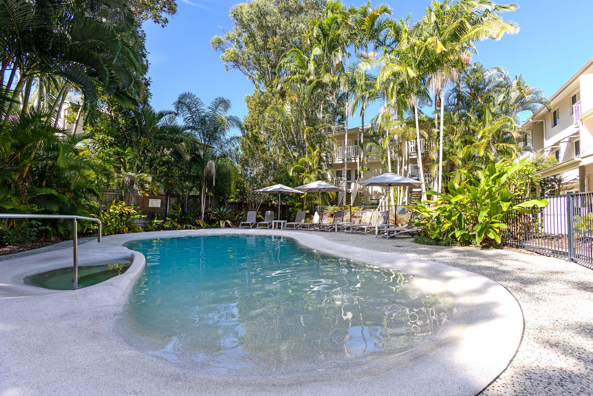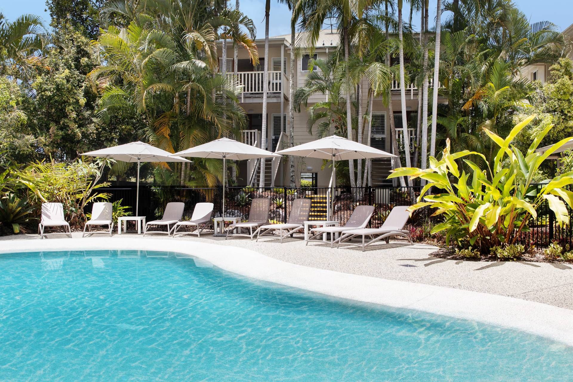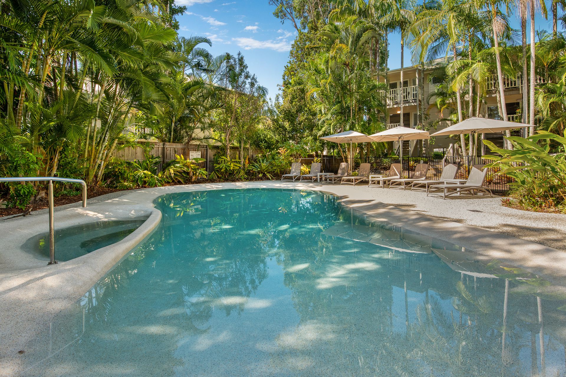 Guests enjoy full access to resort facilities, including the heated lagoon-style swimming pool, BBQ area, and tropical garden surrounds.