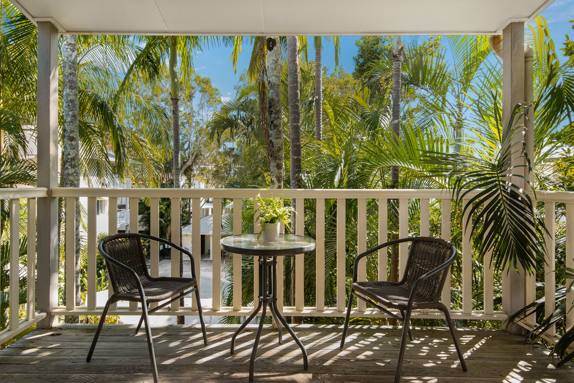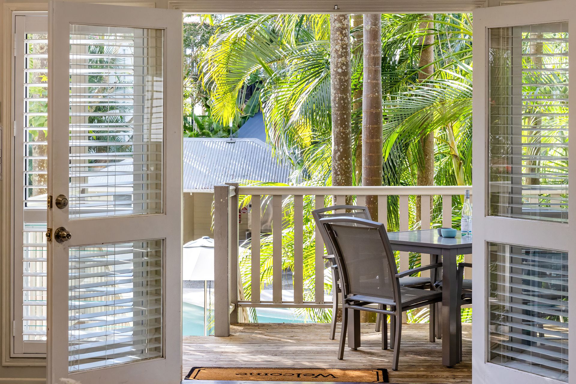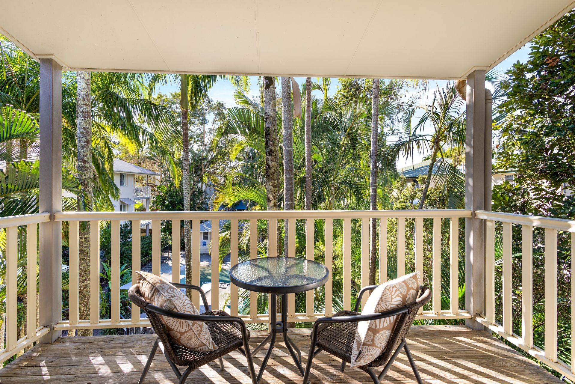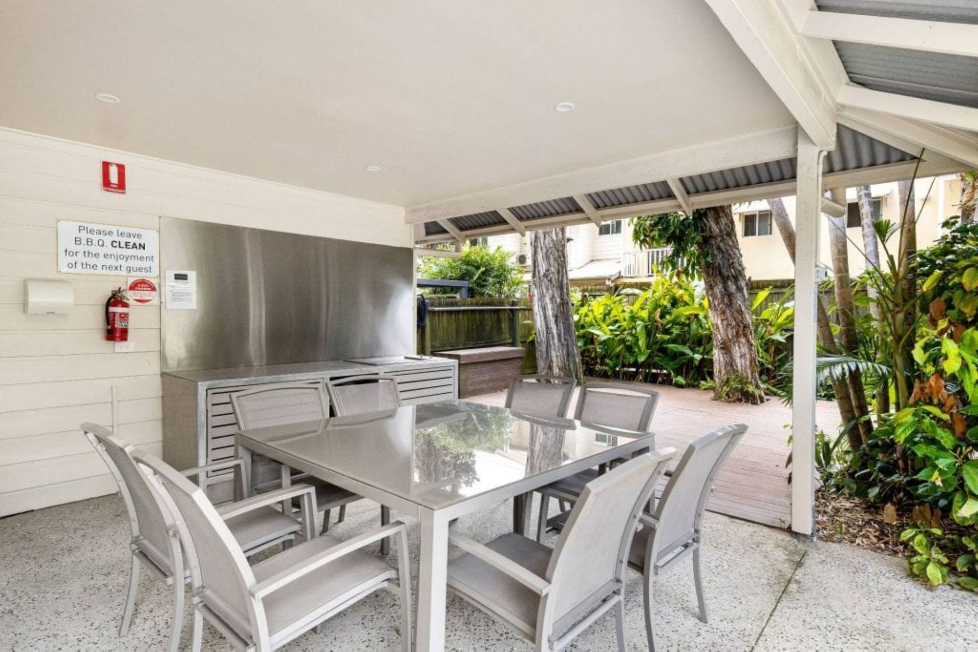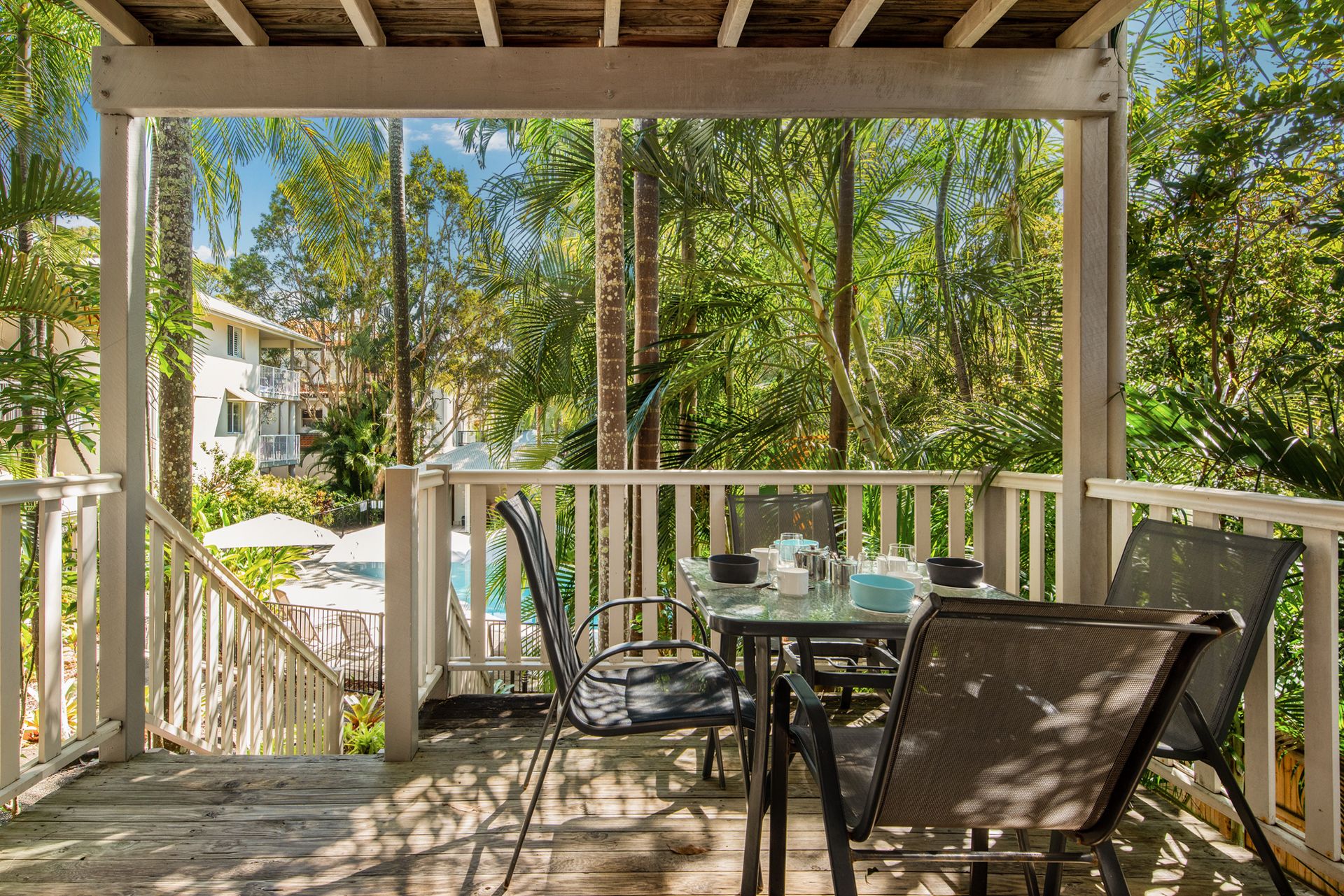 Guests enjoy full access to resort facilities, including the heated lagoon-style swimming pool, BBQ area, and tropical garden surrounds.