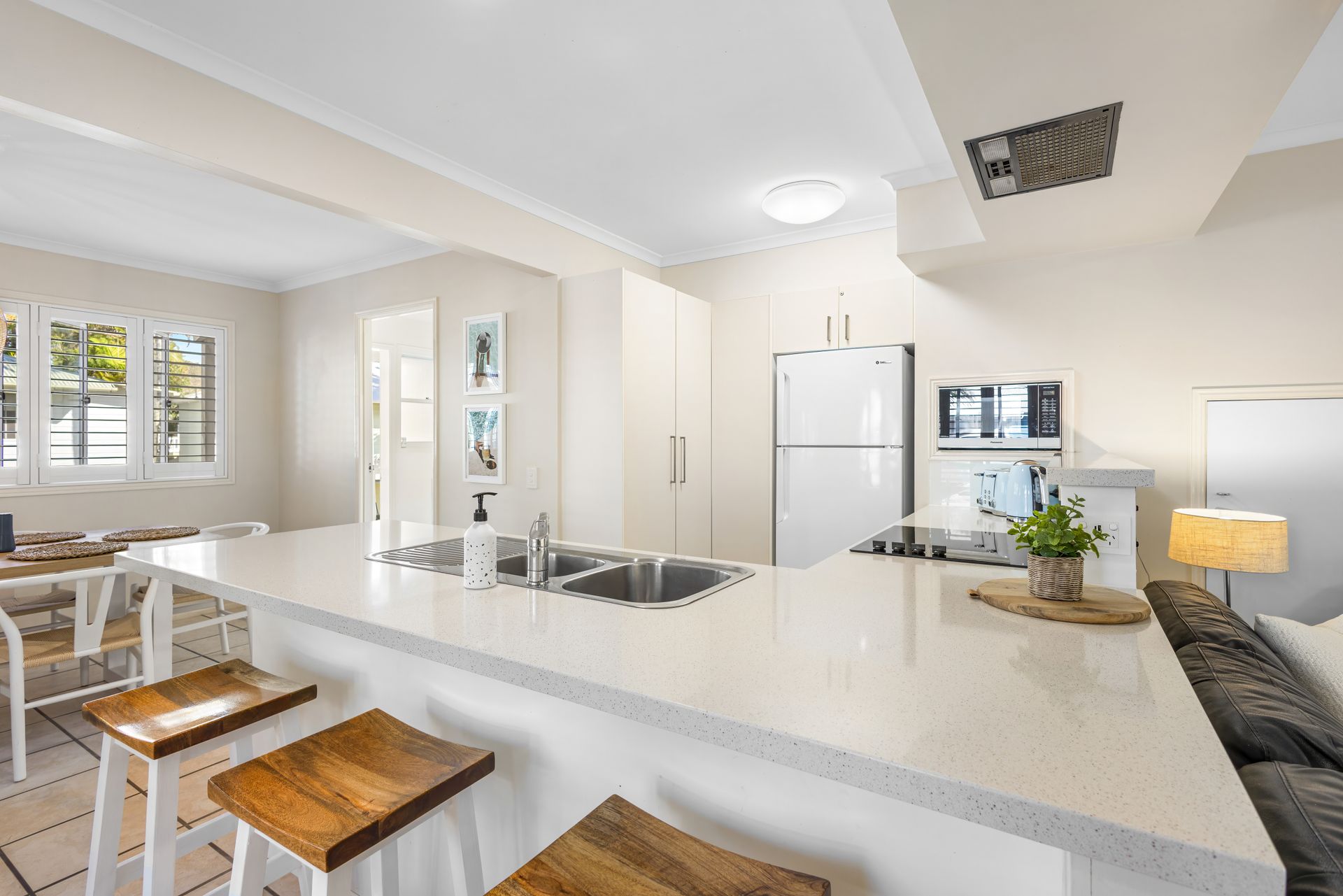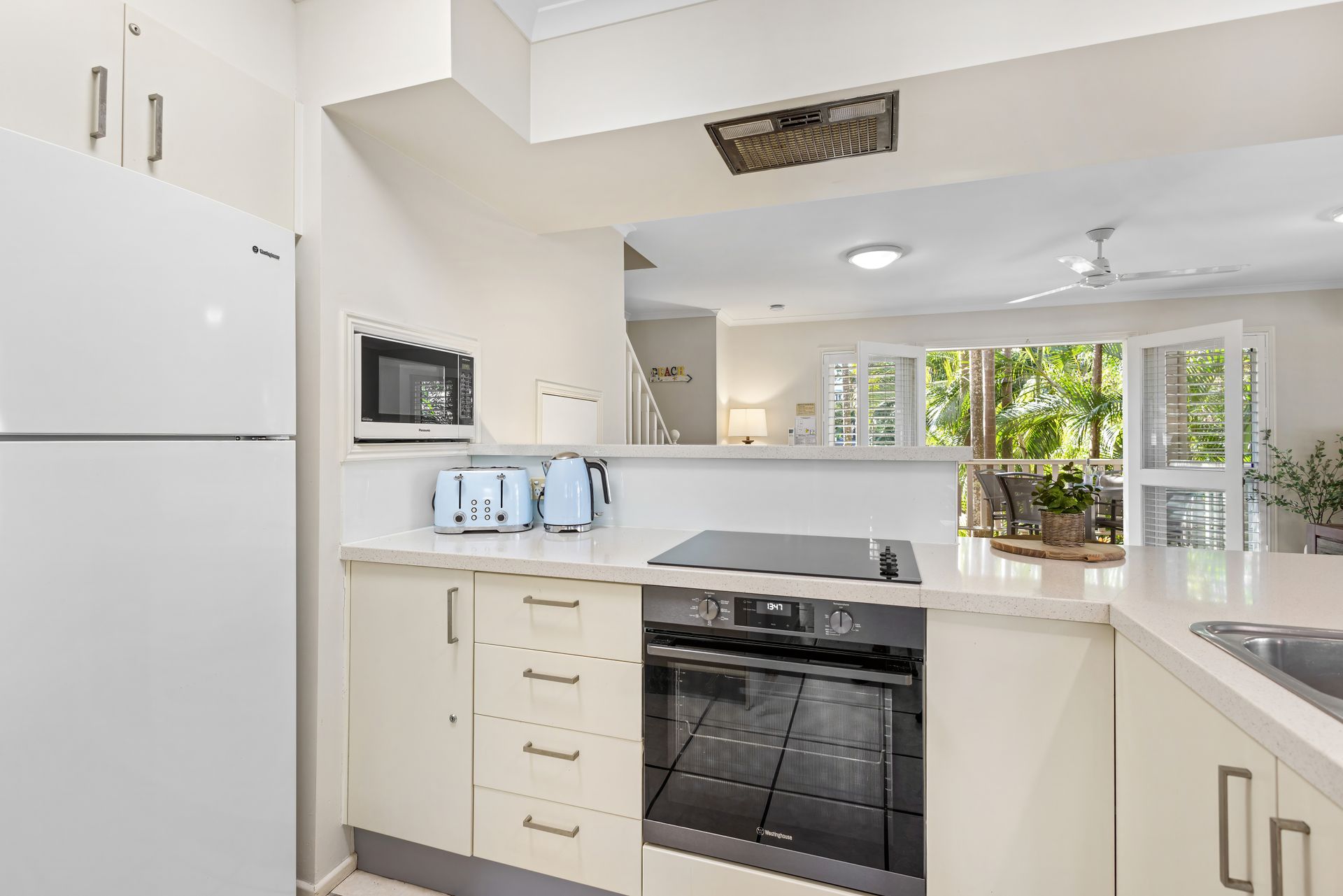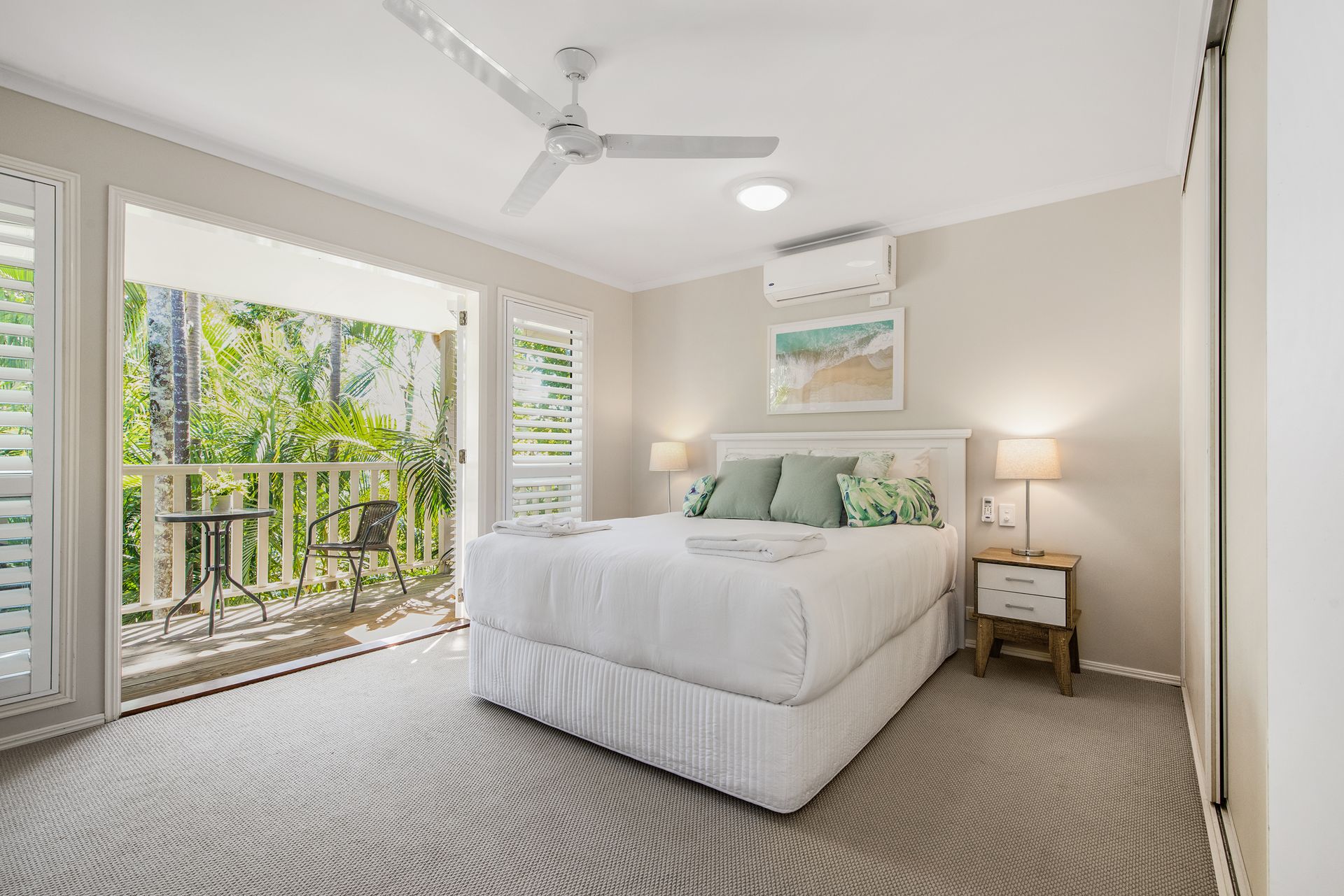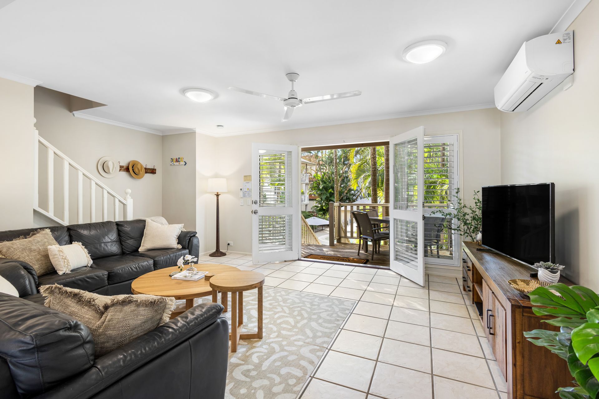 Upstairs hosts three fully ducted air-conditioned bedrooms. The master bedroom includes a Smart TV and private balcony. All bedrooms have ceiling fans for your comfort.
