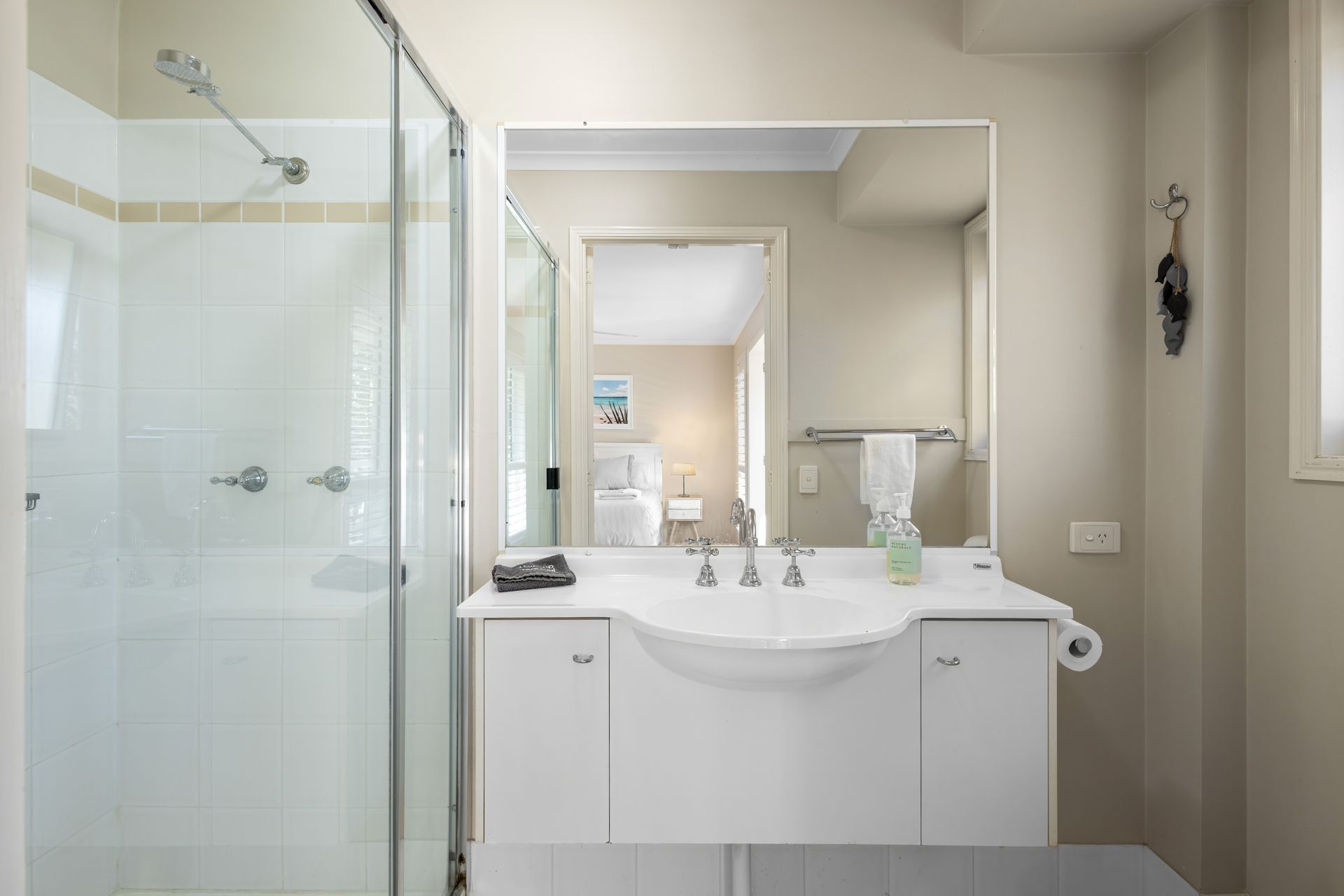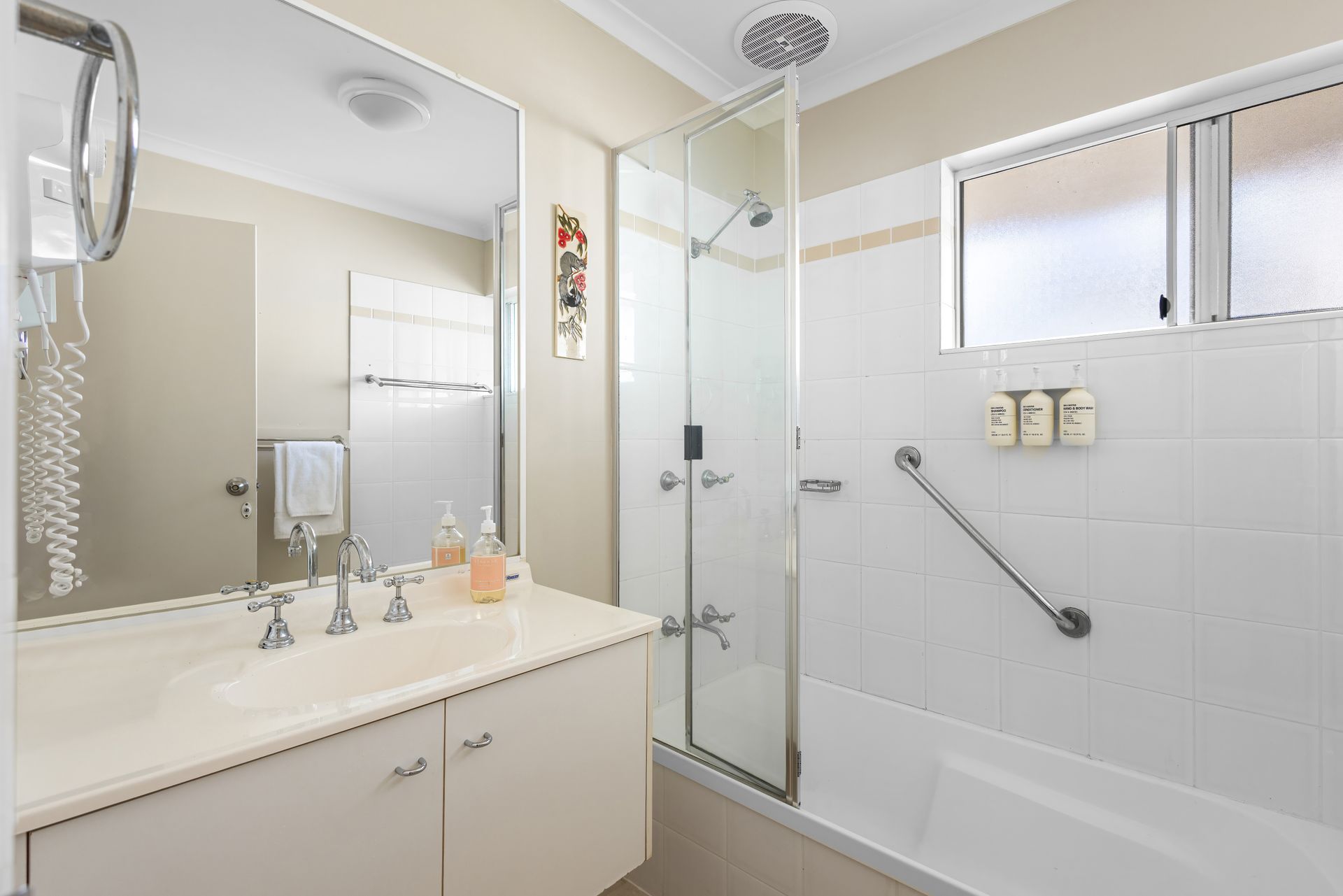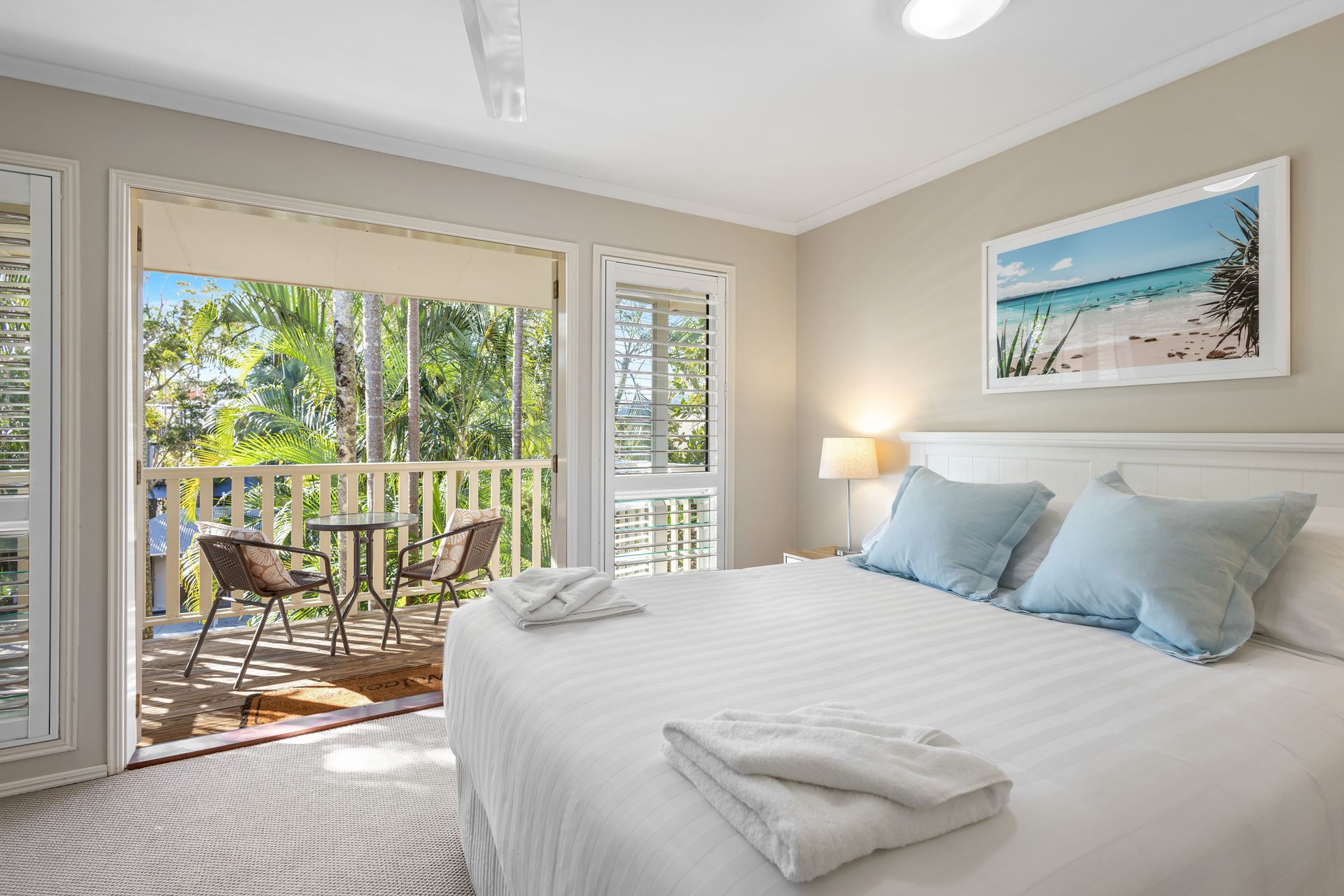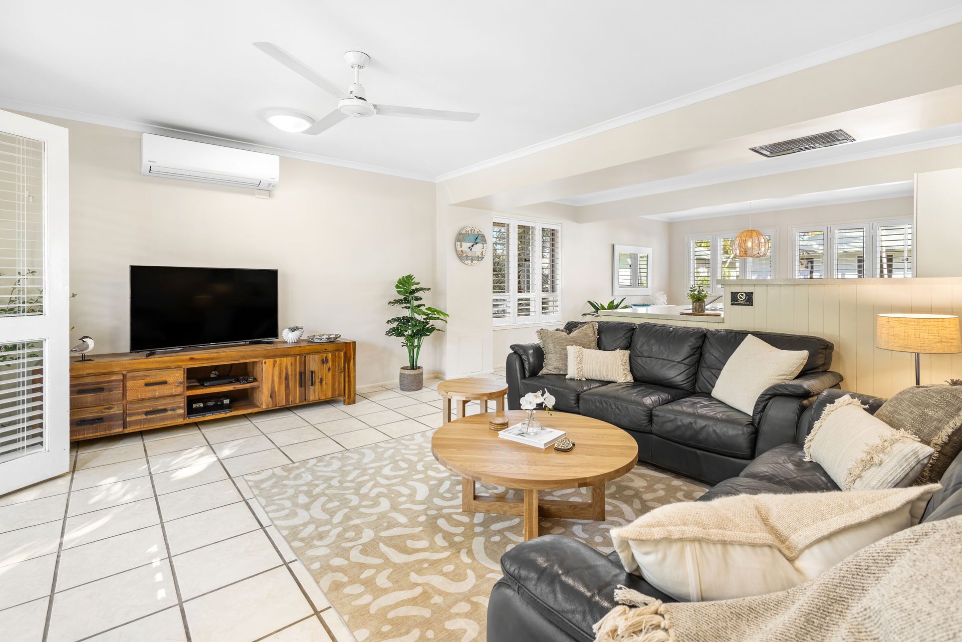 Upstairs hosts three fully ducted air-conditioned bedrooms. The master bedroom includes a Smart TV and private balcony. All bedrooms have ceiling fans for your comfort.