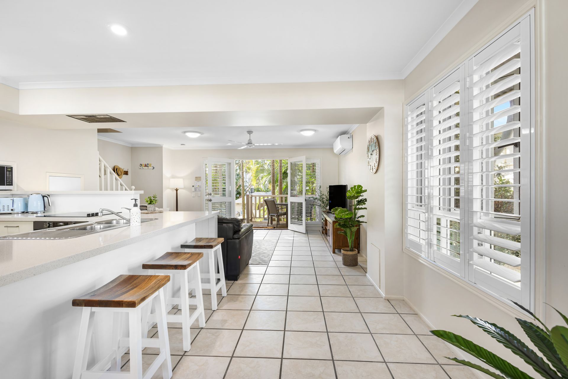 Downstairs features an open-plan kitchen, air-conditioned dining and living area with Smart TV, opening onto a furnished balcony overlooking the resort’s heated lagoon-style pool. A convenient laundry with shower and toilet is also on this level.