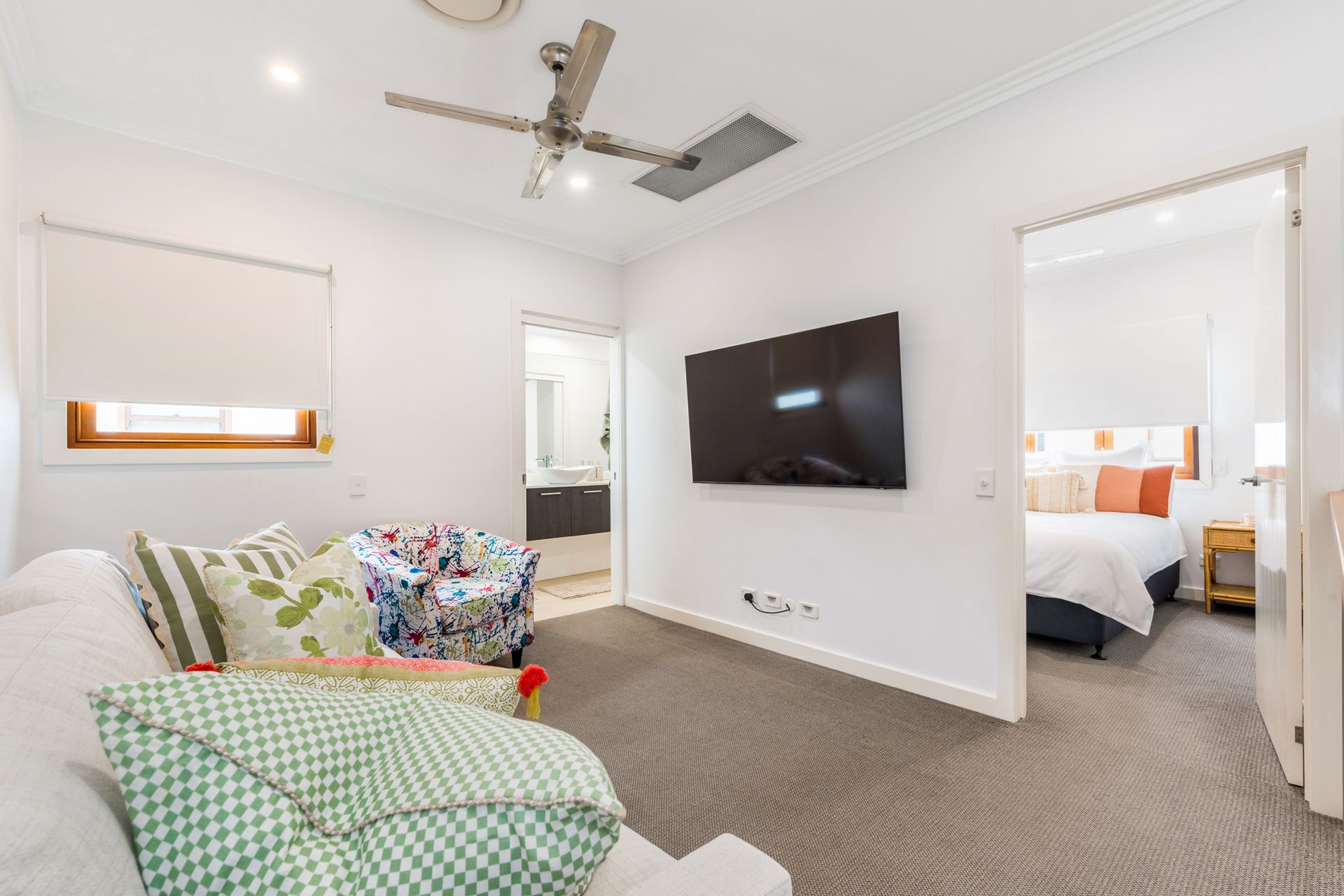 This two level duplex features upstairs master suite with king bed, wall hung Television, private balcony overlooking the pool, walk in robe plus ensuite featuring walk-in shower and large vanity, a second guest bedroom with Queen bed, 2-way bathroom plus a sitting room with wall hung 65” TV.