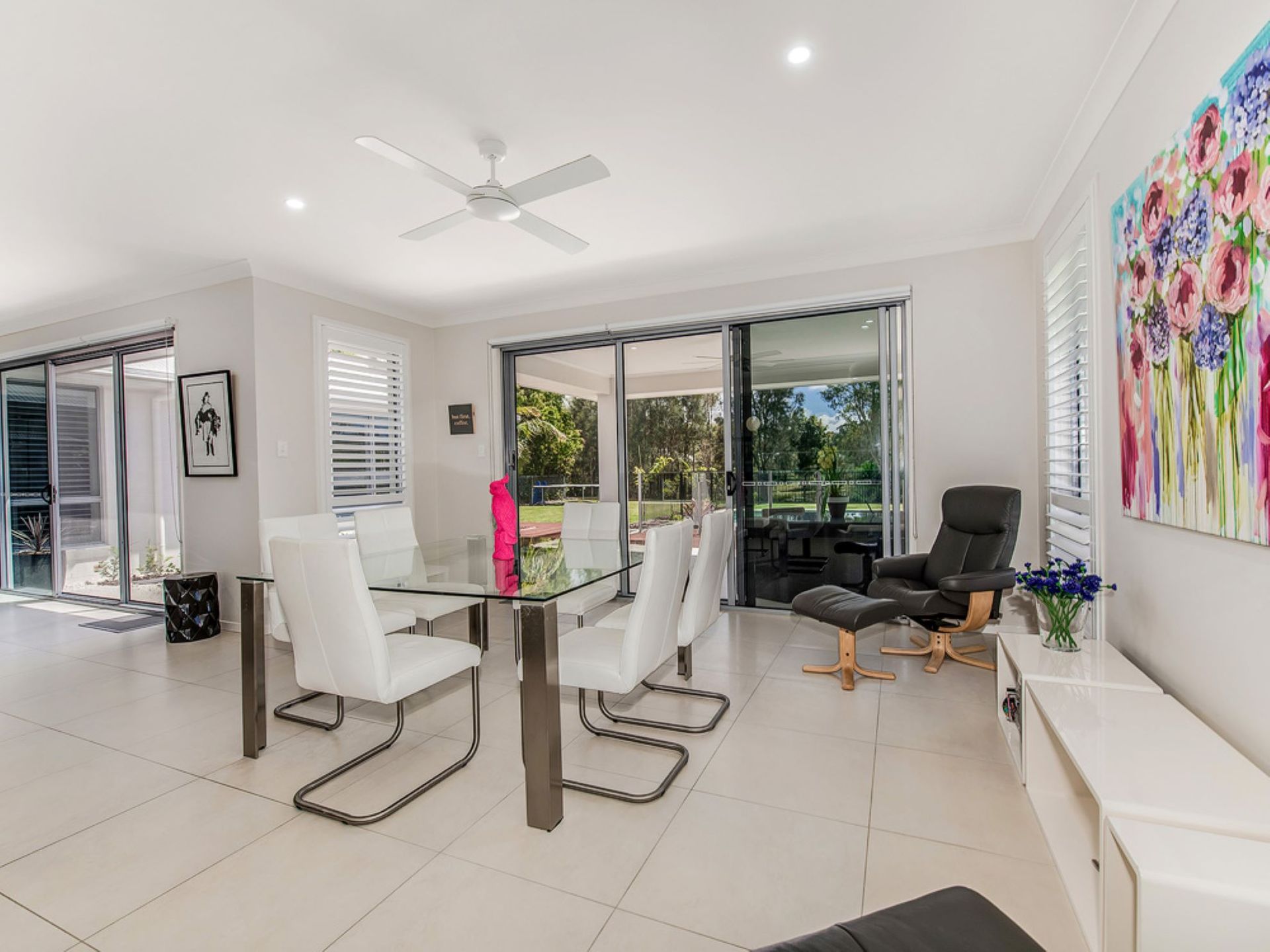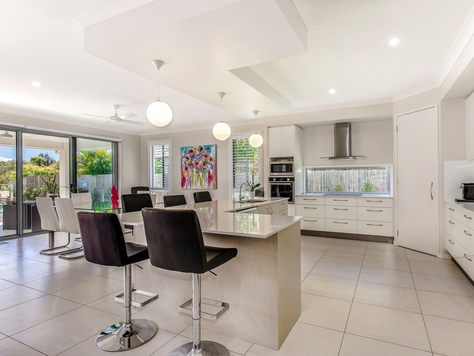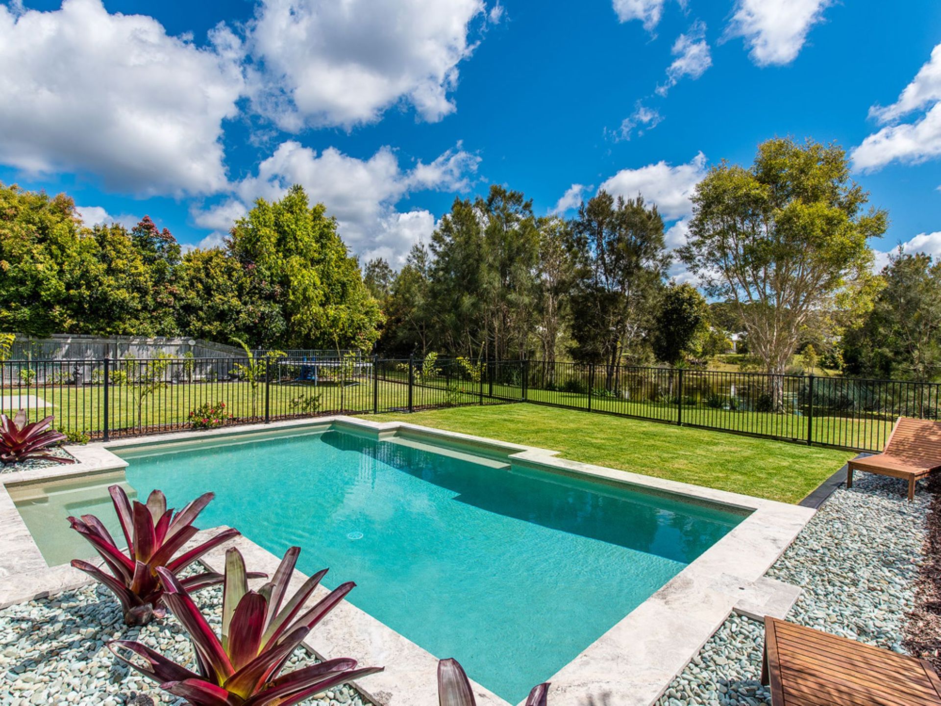 It has an open plan kitchen and dining area; 3 bathrooms; 2 separate entertaining areas with a designated wing for kids or those who prefer some peace. From the large kitchen or outdoor patio area, you have a full view of the fully fenced, in-ground pool and a private view of the peaceful lake behind our property. It features a landscaped and fully fenced backyard so that children can safely play.
