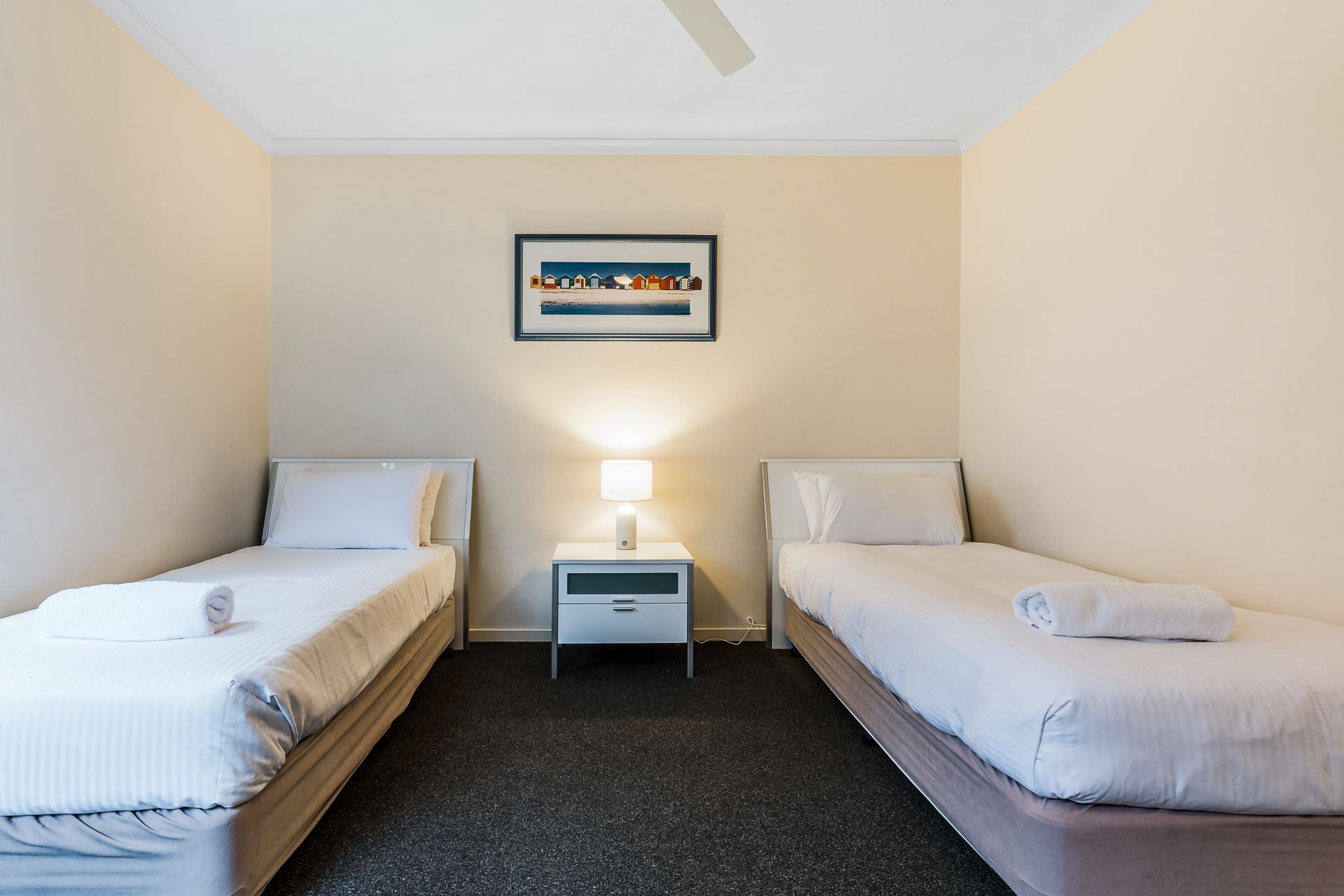 The apartment features 3-bedrooms sleeps 6 people. The master bedroom has a private ensuite, Walk In Robe and wall mounted T.V, the second and third bedrooms share a family bathroom.